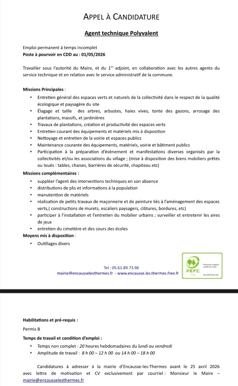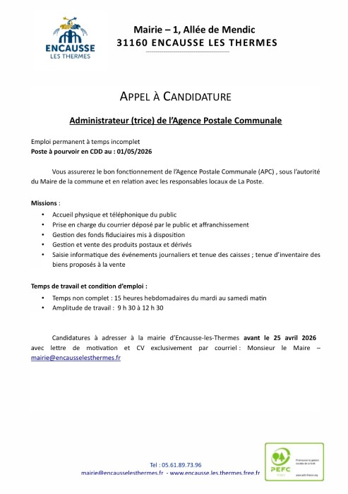 La commune d’Encausse les Thermes recrute un(e) Administrateur (trice) de l'Agence Postale Communale et un(e) Agent technique polyvalent(e)